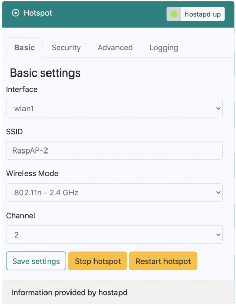 1. In the RaspAp web GUI, go to Hotspot > Basic tab to create the base configurations. Configure an AP for the onboard wlan0 interface with the settings shown below. Choose Save settings to write this to the filesystem. wlan0 is the onboard WiFi, which we’ll be using as fallback / backup to the USB Wifi dongle. So I recommend setting it up with a 2.4Ghz network.