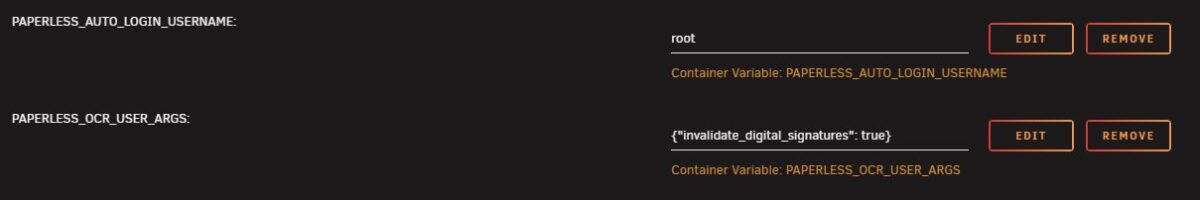 Variable, with the namePAPERLESS_AUTO_LOGIN_USERNAMEand set the value toroot. - OCR Settings: If you receive documents with digital signatures (specific to some providers, in my case electricity bills for some reason) that prevent OCR, you can bypass these signatures. Add the variable
